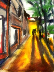 So I didn’t wind up getting a lot of painting done last night or tonight, but I did get quite a bit done Friday. In this pic i’ve start defining areas of color and tweaking the perspective a bit. I hopefully will have it finished by early next week. It’s only 9″x12″ so it’ll be extremely affordable. Plus, due to its size I’m shooting for some more spontenaity. We’ll see if I can let go of the reigns a bit.Ok… very very sleepy… time to go now.