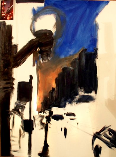 I did get a start on a new piece last night. I’ve got a show coming up in December (details to are coming). I’ve been asked to do some large paintings for it and I have to say that I’m excited to be working big again. Last night I really went after it and worked up a sweat. Painting large is so physical. I can get my whole body involved. It’s almost like dancing in some ways which I LOVE to do. I didn’t cover a lot of territory, but it’s a good start. I’m laying out the values and larger areas of color again. Beginning to put the elements and characters into place. I’ll keep posting updates to show you the progress.