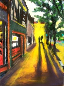 So having had my faith in humanity and myself somewhat restored I got to work last night with a sense of privilege and hope. I got some more work done on both of my paintings in progress. On the smaller piece (pictured here) I’m refining. Fixing colors and forms. Pushing and Pulling the light and dark elements to achieve a balance. To create contrast. Plus I need to work on my lines. They’re all over the place. On the larger one (pictured in yesterday’s post) I’m still laying out the larger areas of color. A lot of which will wind up as underpainting to be covered with areas and layers of other colors to create variation and depth (look at the techniques of someone like Dali for a real lesson in layering) . I’m finding the relationships between the forms. Trying to set them on the teeter-totter of composition so they balance in a way that draws the viewer into the picture.