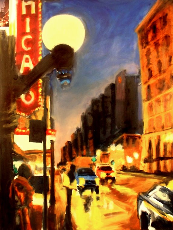 Now, on to the work. The new Chicago piece is looking great. I’ve spent some time last night and over the weekend reworking the shapes of the cards and the background buildings. I’ve also started to give the big, red Chicago sign some more contrast and depth. The big building up front is start to take shape as well. If you look back through the progressive pics you’ll see the windows are starting to form as areas of light and dark are worked back and forth with and against each other(remember: push and pull). I’m still debating on the color of the blue car in the middle ground. In the source pic all of the cars are more or less that cadmium yellow because of the streetlights and storefront lights. So here’s where you have to ask yourself some questions: do you change the color for the sake of some variety or does it detract from the overall composition and color-balance of the piece? Still undecided.