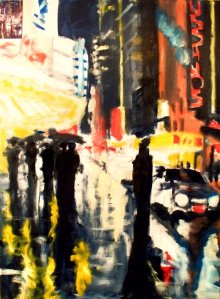 I’ve had a chance to make a little more progress on my latest NYC painting. I’m approaching this with a fair bit of ecstatic energy. I’m using big brushes. I’m attacking the canvas. I’m working up a sweat. I love it. I mentioned in my last post that I’m determined to loosen up and stop nitpicking my paintings to death. They start out with so much energy, but I feel like they get bogged down. It’s all part of the process of learning so I’m good with it. I want to spend my time in the studio not trying to churn out masterpieces (which, in my opinion, happen on their own), but working on myself as a Painter and Artist. The Artist paints him/herself ultimately. One way or another our work reflects who we are, what we’re doing, where we’re at. I think most things we do are opportunities for personal development.