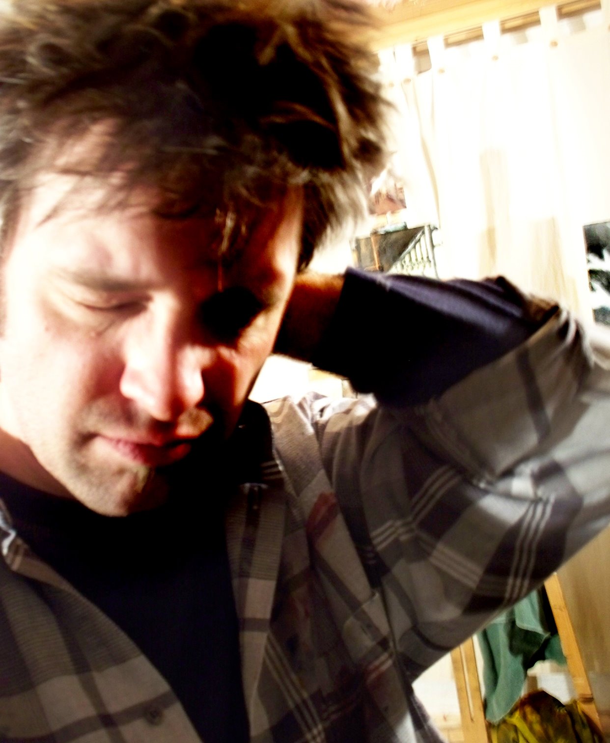 And here’s me in the depths of a painting fugue. I don’t usually post pics of myself because… well, I’m not all that fond of the photos I take, but in this case I’d set up a camera to catch my work in progress with a series of timed shots. I caught myself a couple of times and thought I’d share. When I’m painting, for some reason, I compulsively run my hands through my hair, close my eyes, and fidget a lot. My hair has a tendency to stick out in all directions anyway when left to its own devices, but the compulsive hair-tugging doesn’t help. By the end of the night I’ve got this great Wolverine-thing going on. I’m pretty sure I scared the little one with it last week. Good times.