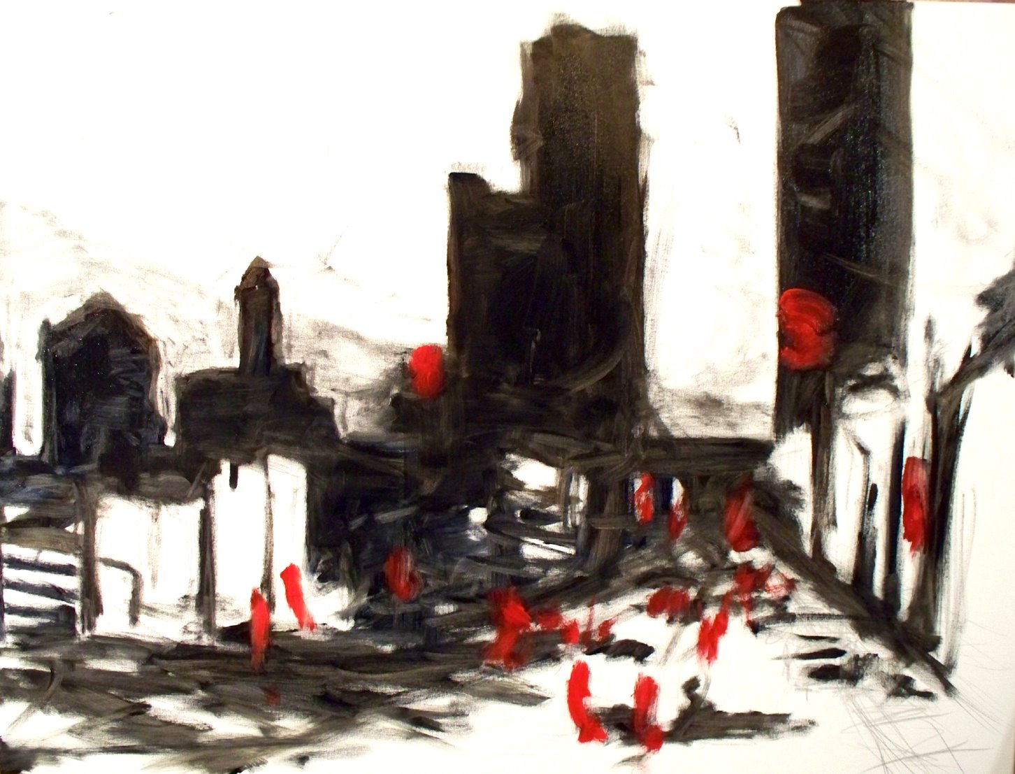 The whole scene gave me a much-needed dose of inspiration. I started a piece late last week out of an overpowering desire to paint. I wanted to do something relatively quickly. Keep it loose. Keep it energetic. I started playing with some deep red underpainting and was able to start working over the top of it. Having them for company kept things very lively. A definite energy carry-over into my painting. I was bolder with the brushes and actively avoided impulses to “clean” things up. Actually I’m going back over a bit of the street where the colors started to muddy. They’ve lost their energy and that’s no good.