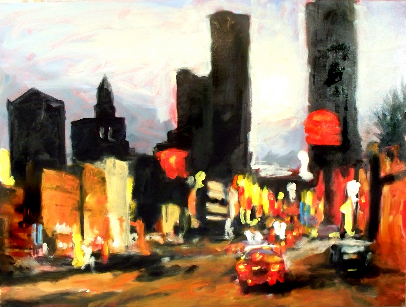 Also I’ve finished my latest painting. I think this is a land-speed record for me. At least for a piece this size (36″x48″). I’m very happy with the way it came out. The piece overall is very loose and energetic. I’ve been using it as practice for the Des Moines Art Festival Mural project. I needed to loosen up. To make sure that every inch of the image had something going on. Not a necessity for all of my work, but for that project I’ve got instructions to make sure that there’s a lot of visual activity. When the piece is enlarged the little things will become very visible: the funky, little edges of brush strokes, slight variations of color, etc. I think this latest piece has been a good exercise in working towards that, AND in working with more immediacy. It’s going to a good temporary home at ArtDive so hopefully you can go see it and pieces by many other great Iowa artists in person.