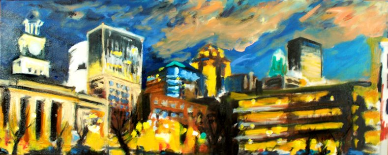 Here are some recent updates. The sky is coming along nicely and the buildings are starting to shape up. I’m trying to mix the man-made illumination with the morning light. It’s a juggling act, but it’s meshing nicely. Last night’s progress made great strides towards making the buildings relate to each other in style and coloring as well helping to unify the composition as a whole. Like I said, I’ll get more shots tonight and post them later. You are going to be seeing a lot of changes in a very short time. They’ll be small, but significant. Keeps your eyes open.