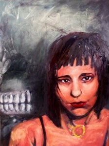 So I’ve been sitting on this photo for the better part of a year. It’s a picture that I really enjoy of a friend of mine. I asked her if I could use it sometime last Winter and she agreed. Then in my usual manner I filed it away for “future use” and promptly forgot about it for 6months. I decided Friday was the night. My commissioned work is coming along nicely (plus it needed an evening to dry up a bit) and I was itching for something different to paint so I printed off the photo and started working. The pace was feverish. I don’t think I looked up for 3 hours. That’s when you know you’re having a good time… Am I right? Yeah. At the end of the that session I’d managed to cover the entire canvas in a fairly well fleshed-out portrait. It needed some refining, but the elements were there. Plus my friend had evolved a friend of her own. He’s kind of creepy and kind of comical. I’m going to say he’s a Yattering. It’s from a Clive Barker story called The Yattering and Jack. He’s a minor demon sent by Beelzebub to torment and irritate. You have to ignore them or they’ll walk all over you… and take your soul to Hell. Some people. Her apparent lack of awareness of the presence of the Yattering is belied by her bemused expression. Oh she knows he’s there and her refusal to acknowledge his deeds is driving him nuts.