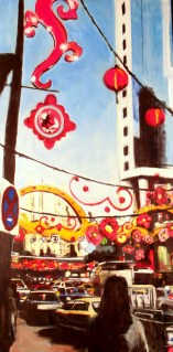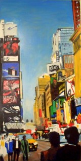 I’m on the last nit-picky bits of the Singapore painting.  About 3/4 of the way through the NYC piece and 1/3 of the way done with Chicago.  I’m starting preliminary drawings on the rest.  I’m also blowing through paint, brushes, and carpenter’s pencils at an impressive rate.  Perhaps if I cared for my brushes a bit more… Mostly I just use them to death and move on (I know a few people like that).  I’m rotating the current three pieces on and off the easels allowing them a bit of time to dry and allowing myself a bit of time to contemplate my next steps.  The process is working well enough so far although by the end I’d like to have all six up side by side.  In my current studio that pretty much means looking at them in the round.  You do what you can with what you’ve got.
