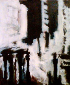 So there you have it. I do prefer it to my first effort. I think it’s a step in reconciling some of the more figurative, monochromatic work with the architectural stuff. It’s like when your left brain and right brain touch. Little flashes go off.