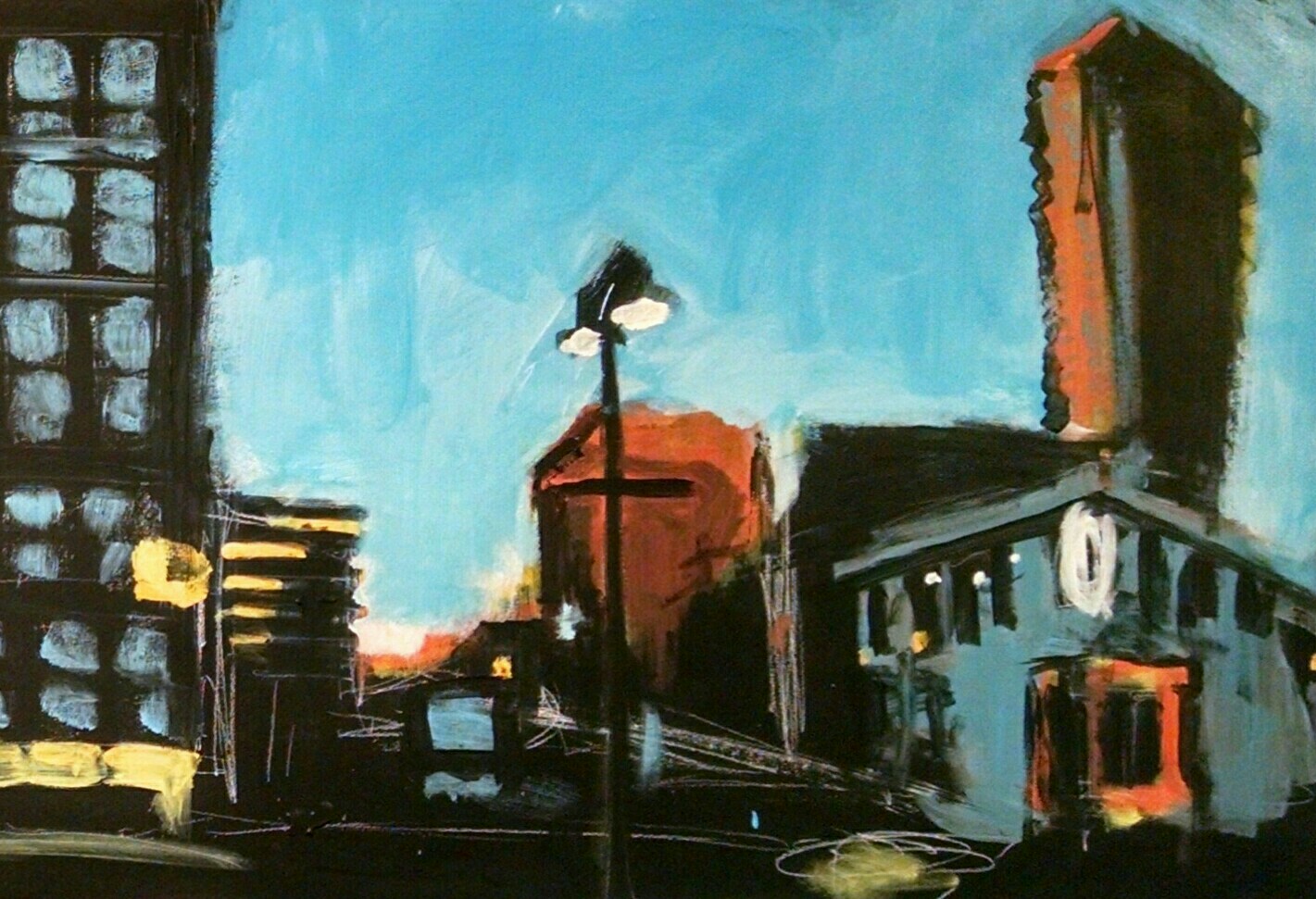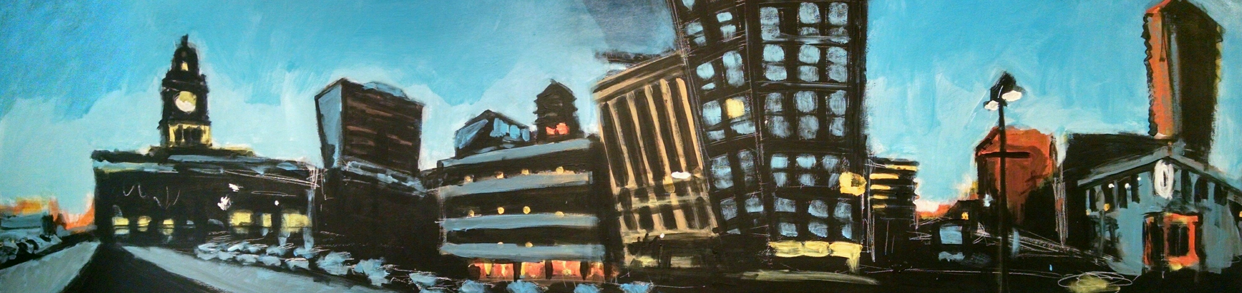 It’s been kind of a slow Summer due to some technical difficulties, scheduling conflicts, and an injury that kept me from climbing the four flights of stairs to my studio for a little while. I had grand designs of working on this series of paintings based on some photographical experimentation I’ve been doing. It took me ages to finish the first. I was determined that the second move along a bit more quickly. To that end I switched from using oils on linen to latex house paint on maple panels. The process is… slightly faster. This is the fruit of one afternoon’s labor. While it’s not quite finished we’re pretty darned close. As per my notes from the first go ’round I’m sticking with my first instincts, moving more quickly and definitively, and just leaving it the f**k alone.