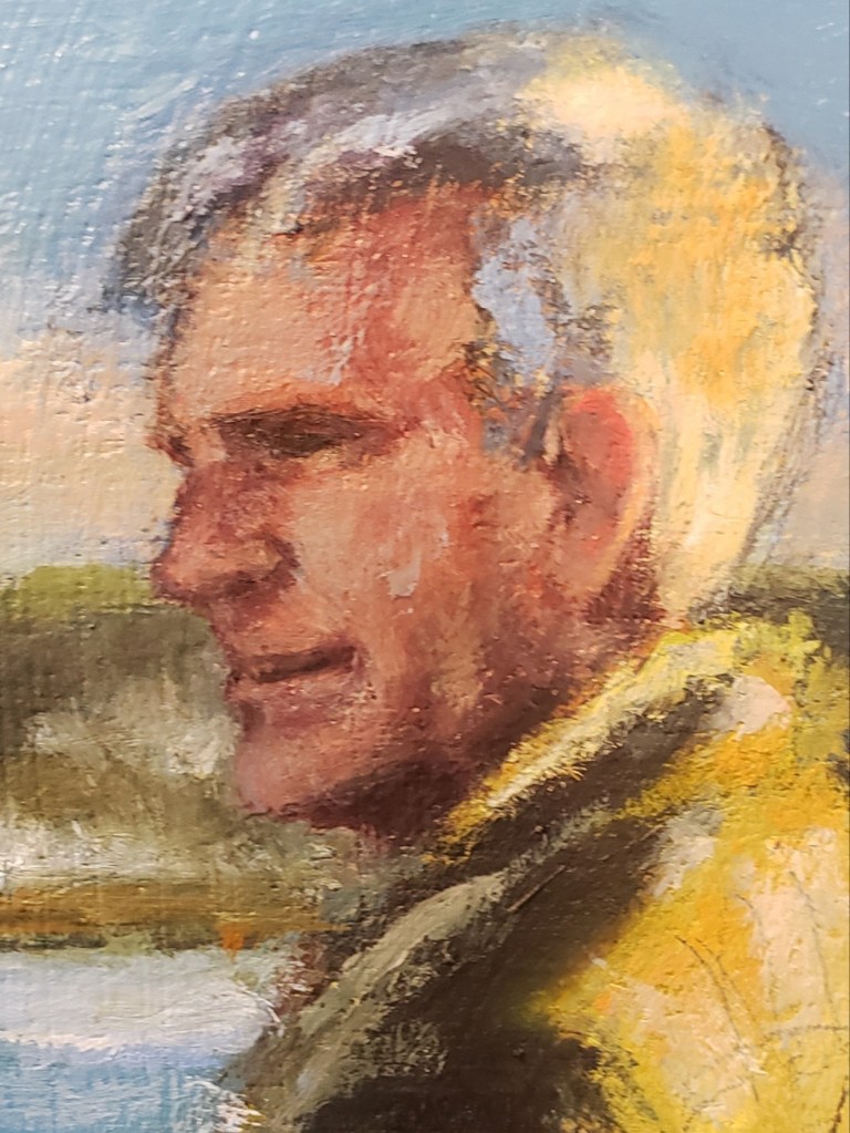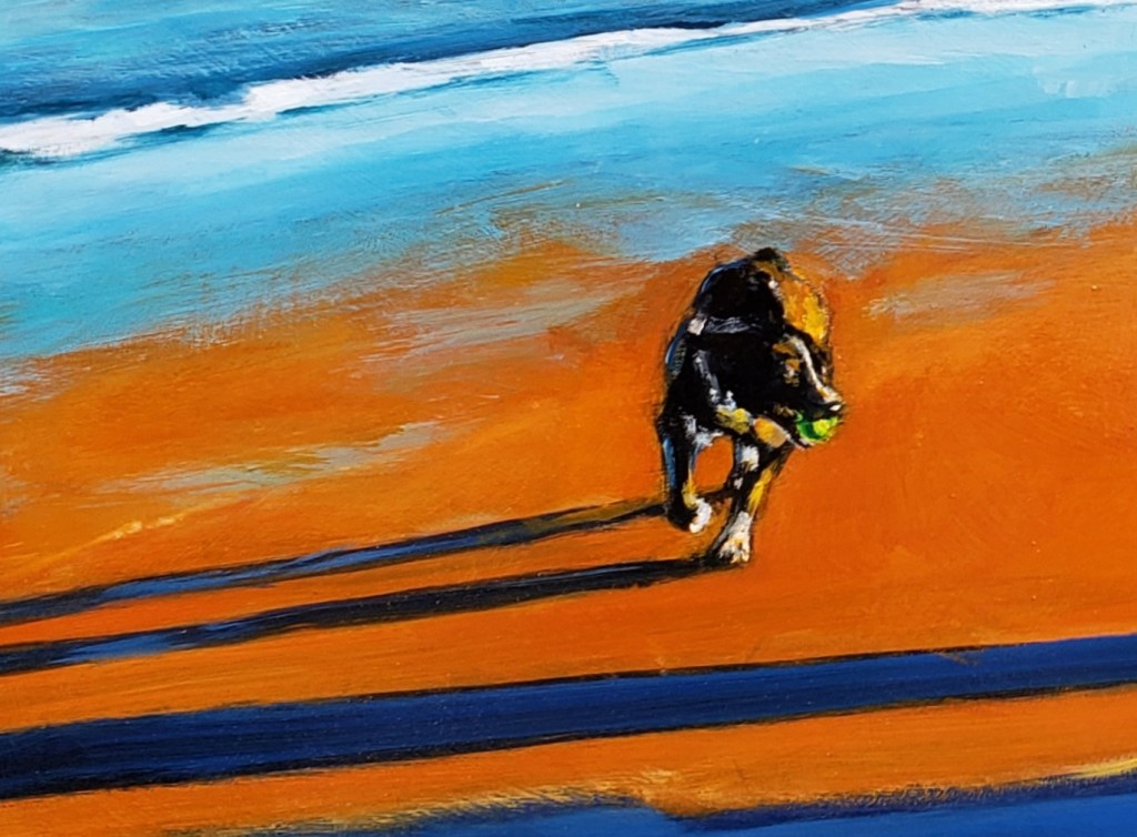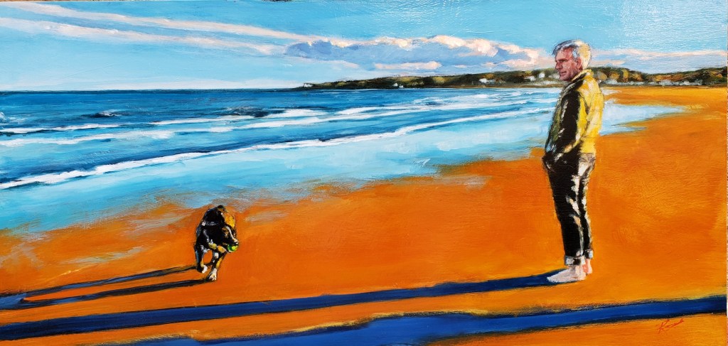 This little beauty was a gift for one of my oldest friends. We met in 1976. Kindergarten. We’ve been friends more or less every since. I visited him a couple of years ago and got some phenomenal shots of coastal Maine. In thanks for he and his wife’s hospitality I thought it might be a nice gesture to paint a shot I got of him and his dog, Scout, playing on the beach. It’s his happy place and it was a beautiful day. Definitley a moment worth commemorating.